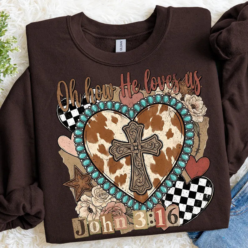 Western Oh How He Loves Us Sweatshirt - Also in Plus Size