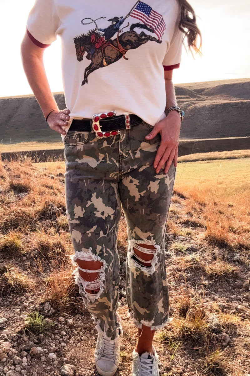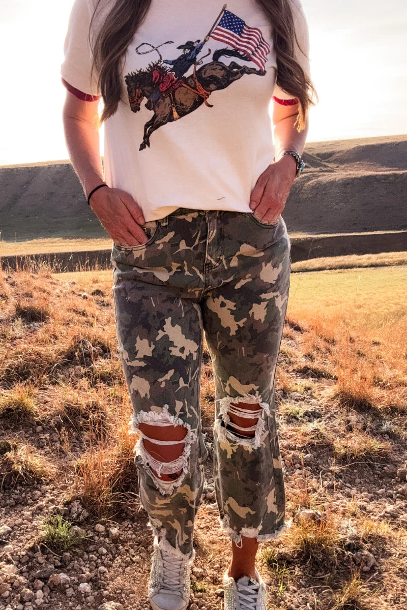 Camo and edgy distressed holes at the knees. The raw hem hits right at the ankle, perfect for showing off your favorite shoes while keeping things effortlessly cool and playful.