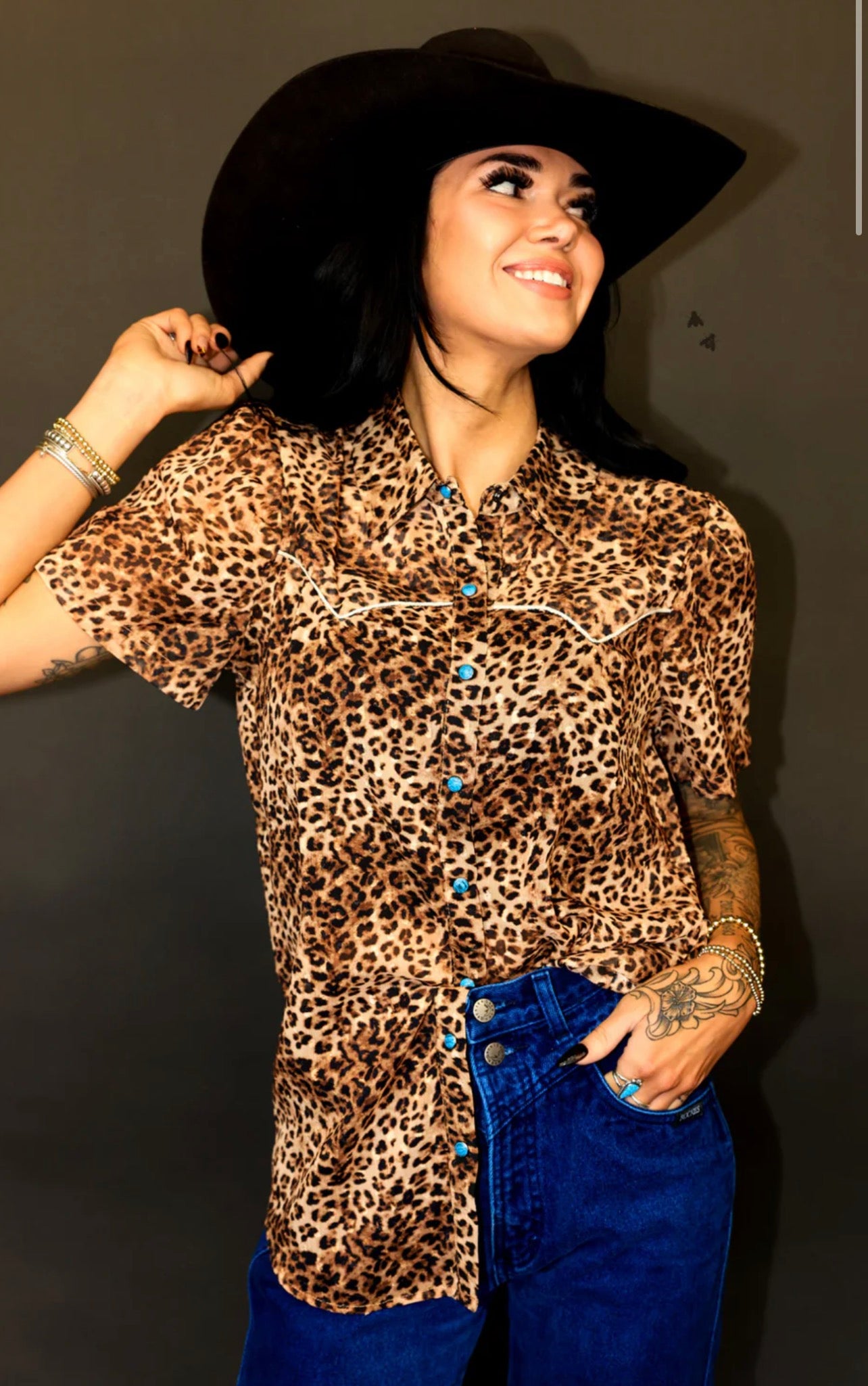 Statler Leopard Turquoise Pearl Snap Button Up Top - Also in Plus Size