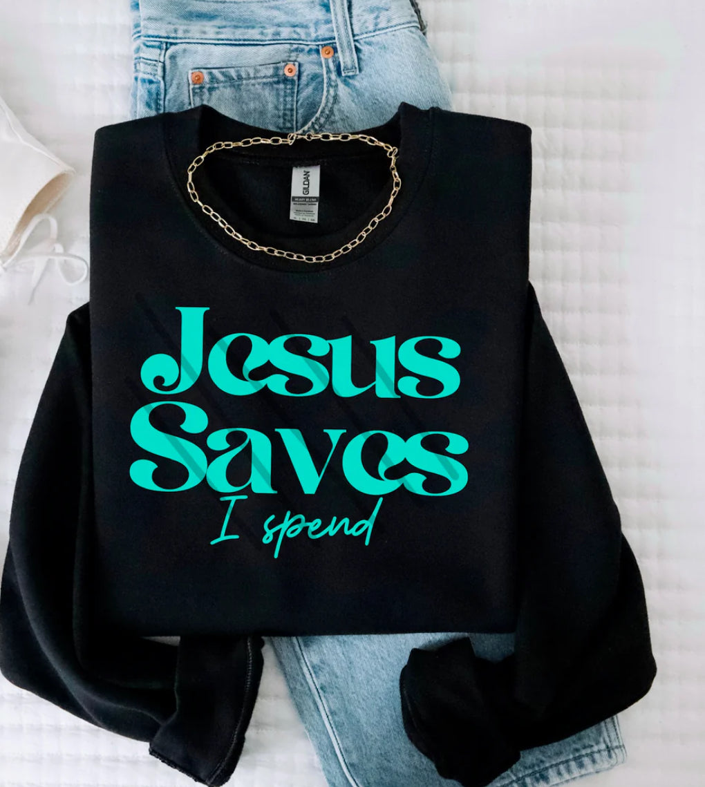 Jesus Saves I Spend Turquoise Print Sweatshirt- Also in Plus Size