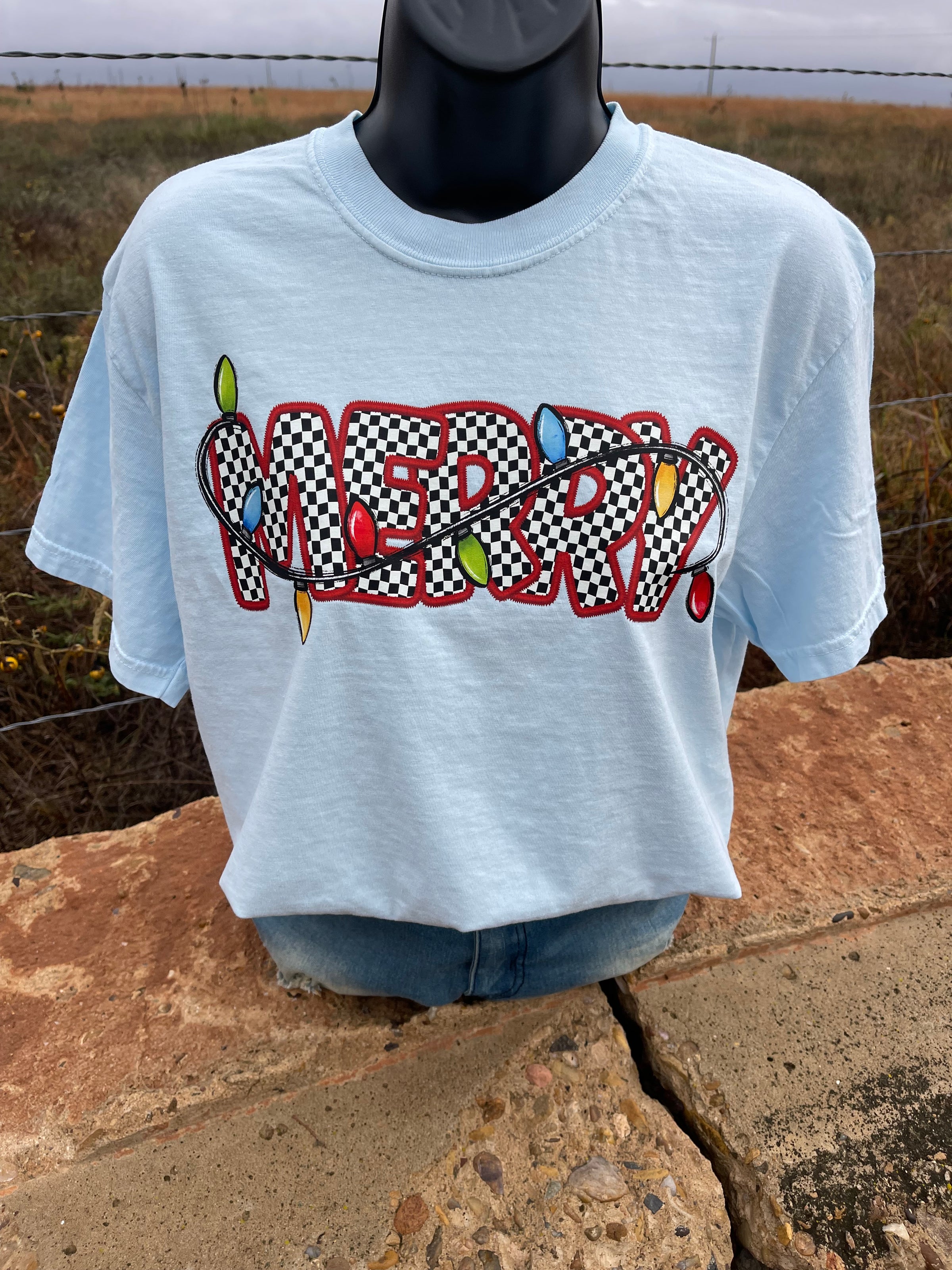 Merry Checkered Lights on Blue Tee - Also in Plus Size