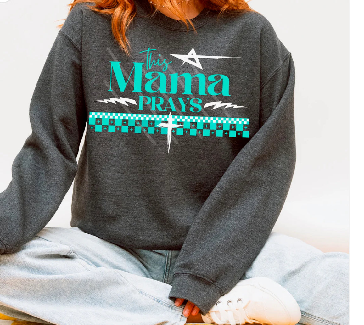 This Mama Prays Turquoise Print Sweatshirt- Also in Plus Size