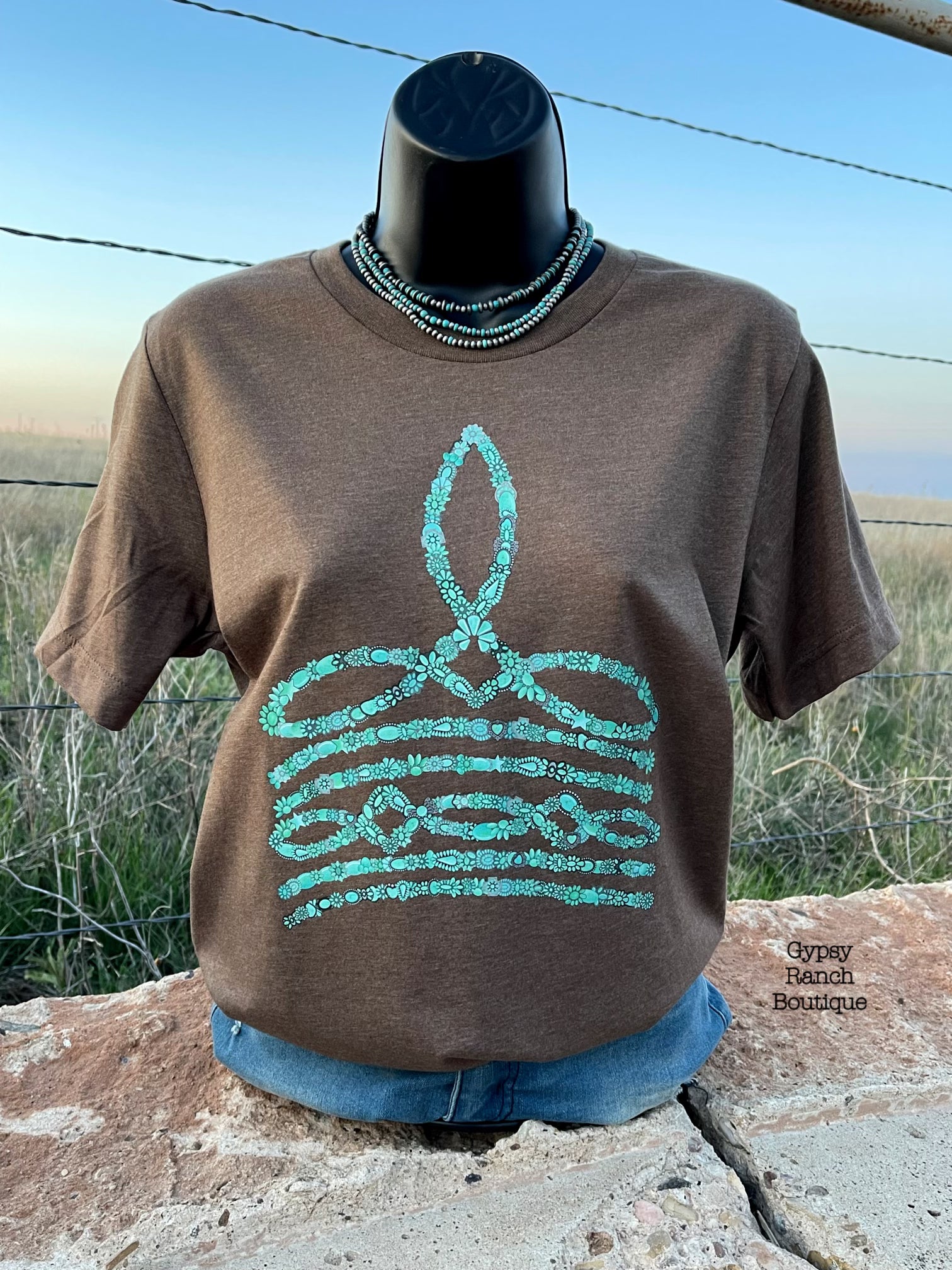 Turquoise Squash Blossom Boot Stitch on Brown Tee - Also in Plus Size